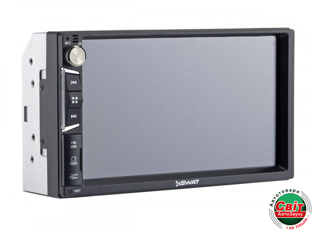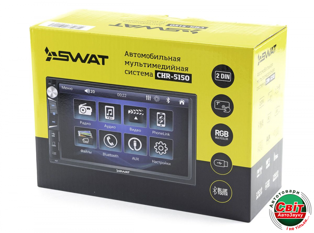 2 DIN магнитола Swat CHR-5150 оснащена широкоформатным сенсорным TFT LCD дисплеем с 7-дюймовой диагональю (177 мм), антибликовым покрытием и повышенной контрастностью. Разрешающая способность монитора – 800х480 пикселей. Интегрированный модуль Bluetooth разработан для использования режима громкой связи и воспроизведения музыки со смартфона.
