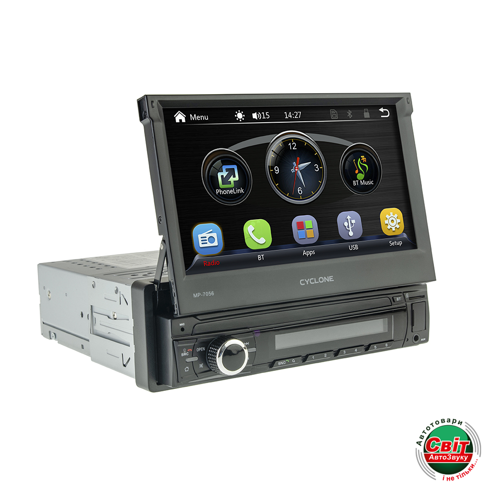 Універсальна 1DIN мультимедійна станція Cyclone MP-7056 на операційній системі Wince 6.0, Мультимовне меню, 7" TFT моторизованний дисплей, Висока вихідна потужність (4 х 45 Вт), Модуль Вluetooth з підтримкою відтворення музики, Вбудований мікрофон, Підсвічування кнопок змінне, Відтворення аудіо, відео, фото з USB/ misroSD. Відеовхід для камери заднього та переднього огляду. Підтримка камер AHD. Підтримка кнопок керування з керма. Підтримка CarPlay/Android Auto.