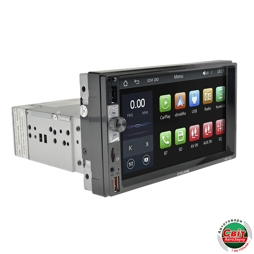 Автомагнітола Cyclone MP-7128Універсальна мультимедійна станція CYCLONE MP-7128 на операційній системі Wince 6.0, Мультимовне меню, 7" TFT дисплей, Висока вихідна потужність (4 х 45 Вт), Модуль Вluetooth з підтримкою відтворення музики, Вбудований мікрофон, Вбудований мікрофон, USB. Відеовхід для камери заднього виду.