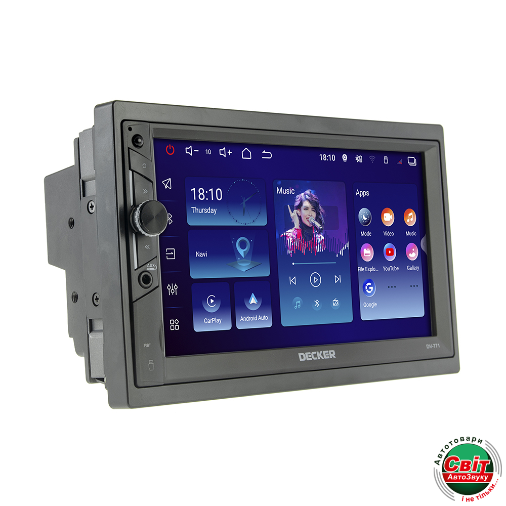 Мультимедійна станція Decker DV-771 під управлінням операційної системи Android 13 - це втілення передових технологій та інноваційних функцій, які доставлять справжнє задоволення за кермом, і дозволить бути в курсі всіх подій і на зв'язку в будь-який час і в будь-якому місці. Сенсорний дисплей розміром 7 дюймів, з роздільною здатністю 1024x600 пікселів, стане незамінним органом управління головним пристроєм, а функція «мультитач» покращує і без того швидку чуйність на торкання. Пристрій оснащений продуктивним 8-мі ядерним процесором A53 (8х2,0 GHz) і 6 GB оперативної пам'яті. Ці характеристики дозволять відтворювати музичні файли, відео файли (з високою роздільною здатністю), а також використовувати будь-які навігаційні програми без гальмування і з максимальною комфортністю. За рахунок вбудованого Wi-Fi модуля є можливість виходити в інтернет, отримувати пошту, дізнаватися погоду, стан пробок на дорозі. Пристрій оснащенний функцією Zlink5 - підтримка (AndroidAuto/ CarPlay). Широкі можливості налаштування звуку завдяки DSP процесору, та 32 - смуговий еквалайзер (від 20Hz- до 20kHz).