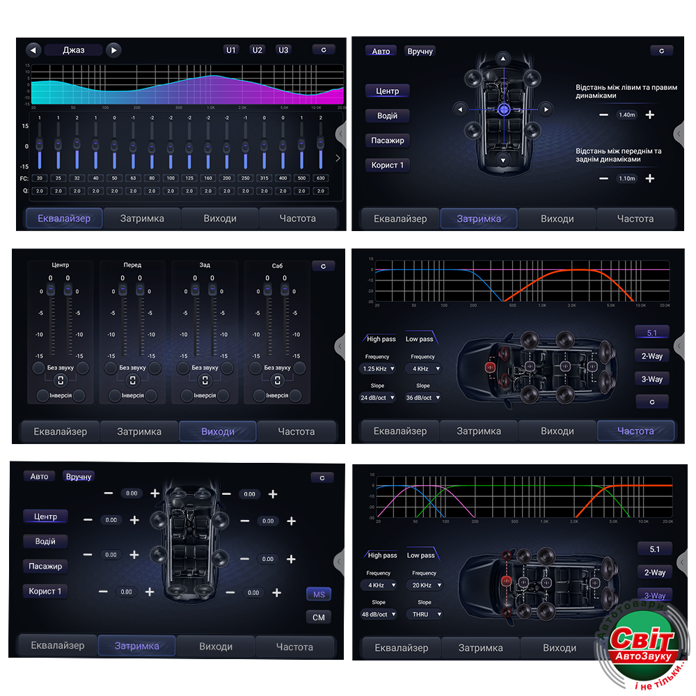 - Аудіовихід (3 канали) RCA -6 шт.(фронт-2/тил-2/центр-2);