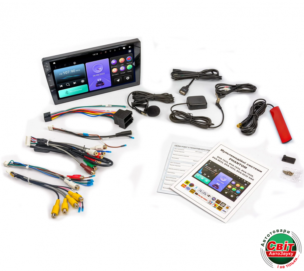 • Кабель керування підсилювачем, аудіо входами AUX IN L, AUX IN R, аудіо виходами RCA FL OUT, RCA FR OUT, RCA RL, RCA RR, CENT, SUB OUT, подовжувач зі слотом під micro-SIM карту.