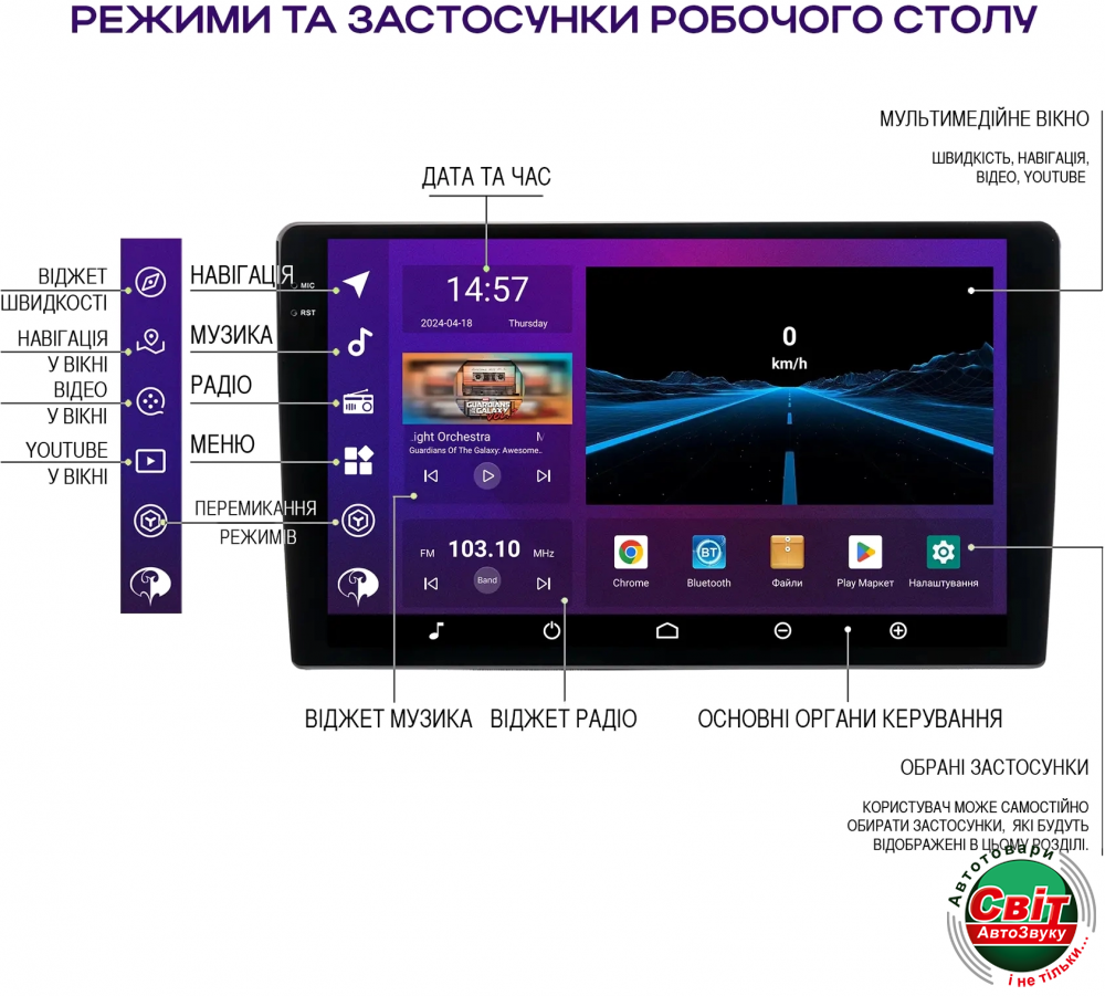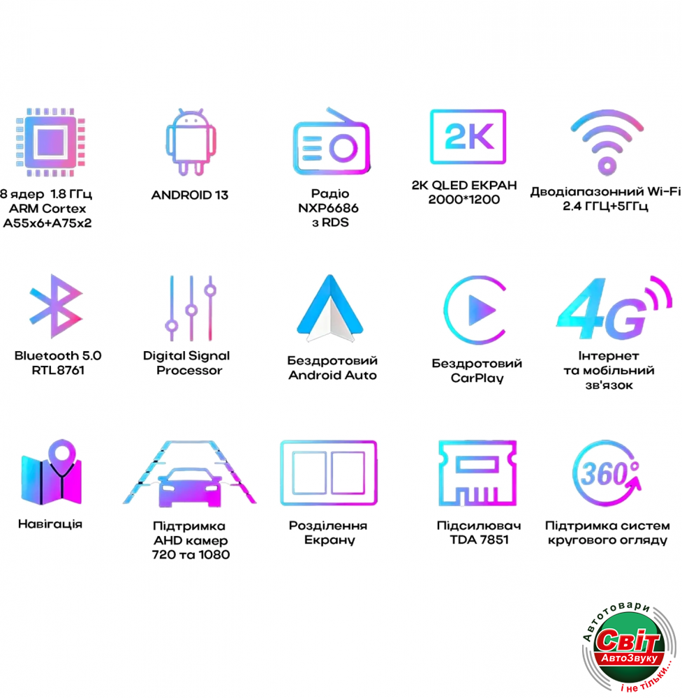 - Радіо тюнер: Si47901, пам'ять на 30 станцій (18 FM / 12 AM), підтримка RDS