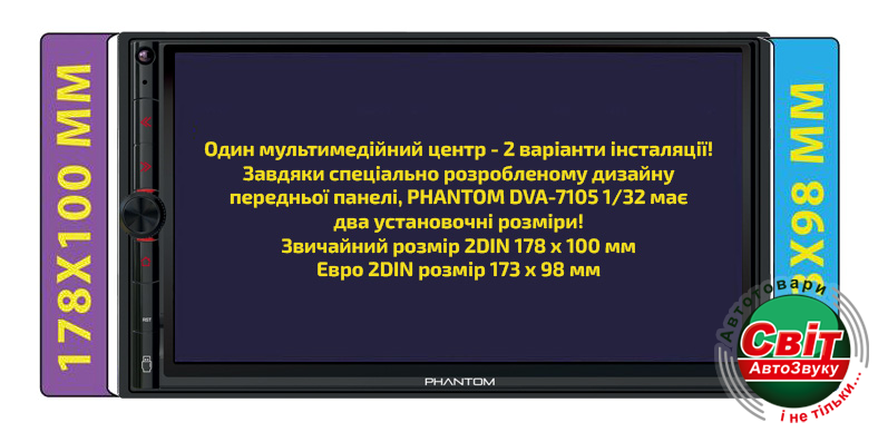 Спеціально розроблений дизайн передньої панелі. Завдяки спеціальному рішенню, PHANTOM DVA-7105 1/32 має два установочні розміри – звичайний 2 DIN 178 х 100 мм та, так званий Євро 2 DIN 173 х 98 мм.