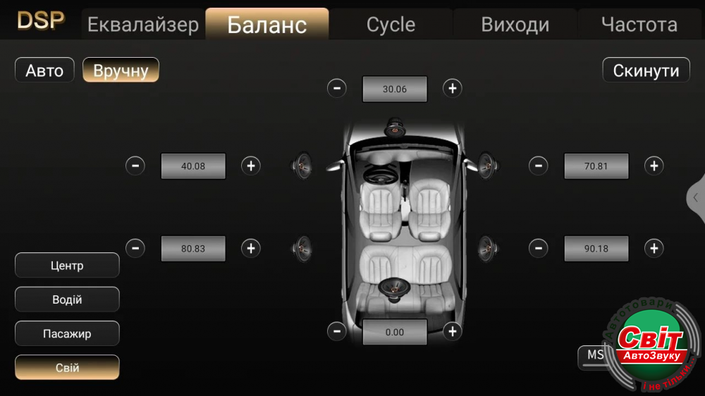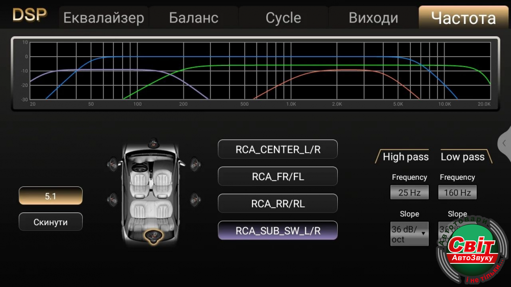 Цифровий сигнальний процесор - спеціалізований мікропроцесор, призначений для обробки оцифрованих сигналів. DSP включає такі налаштування: Еквалайзер, Тимчасові затримки, Cycle (цикл), Виходи, Частота.