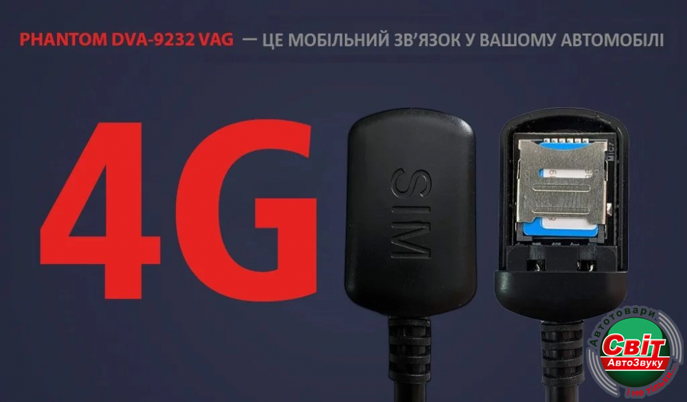 PHANTOM DVA-9232 VAG має вбудований 4G модем з виносною антеною і додаток Телефон. Модем підтримує SIM-карти стандарту micro sim і дає змогу здійснювати телефонні дзвінки безпосередньо з мультимедійного центру. Додаток Телефон підтримує телефонну книгу з кирилицею, розділ обраних номерів, журнал викликів і можливість безпосереднього набору номера за допомогою цифр.