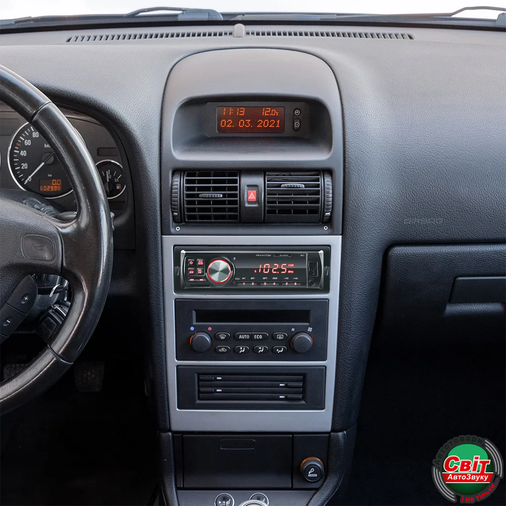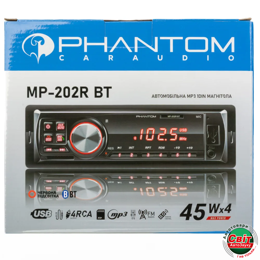 Автомагнітола PHANTOM MP-202R BT має вбудований підсилювач потужності, максимальна потужність 4х45 Вт. На задній панелі пристрою доступні 2 пари лінійних виходів RCA для підключення підсилювача потужності.