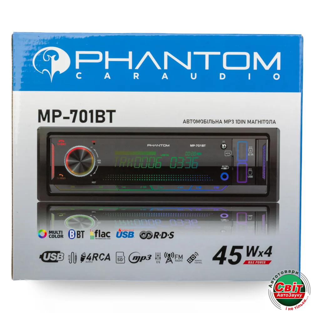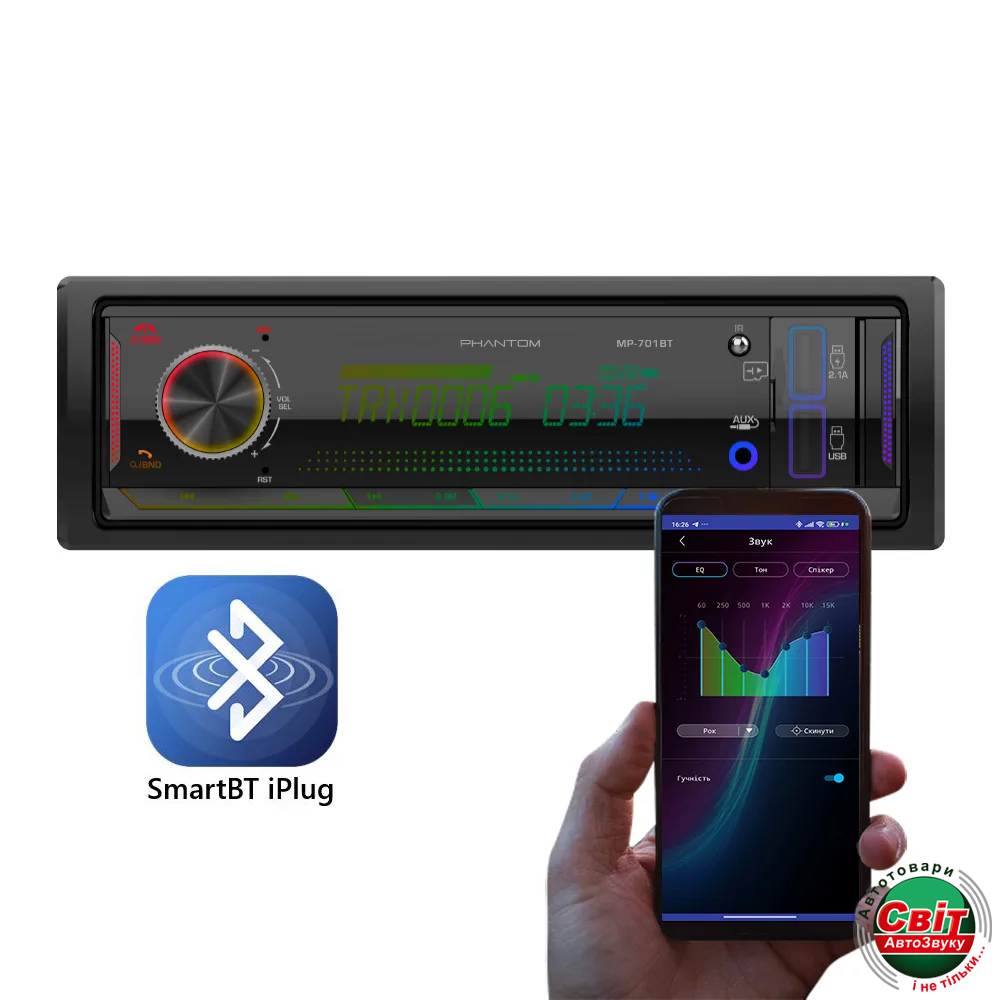 Автомагнітола Phantom MP-701BTPHANTOM MP-701BT – це бездисковий 1DIN автомобільний програвач з можливістю керуванням через мобільний додаток SmartBT iPlug (Android/iOS).