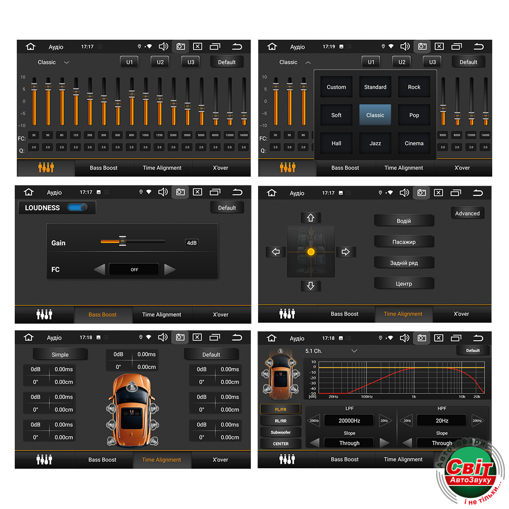 - Аудіовихід (3 канали) RCA -5 шт.(фронт-2/тил-2/центр-1);