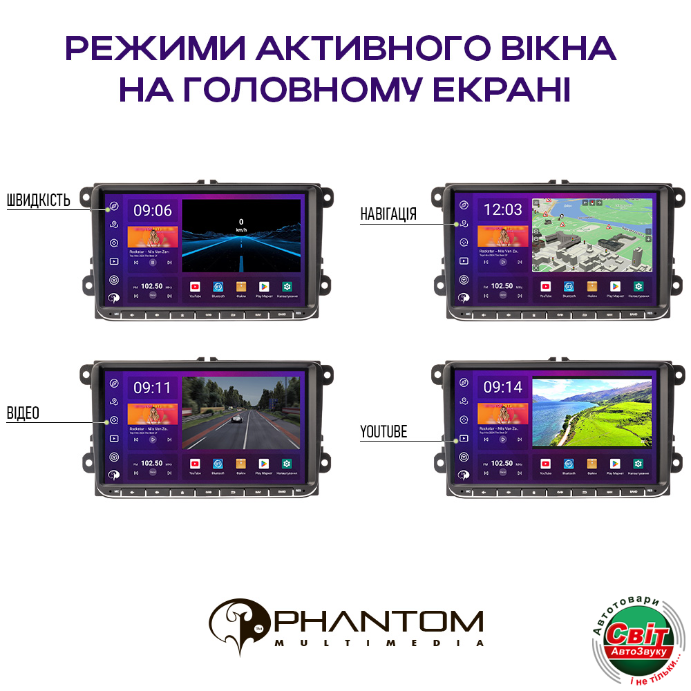 PHANTOM DVA-2K9 Pro 4G 360° 4+64 VW Universal дозволяє абсолютно вільно використовувати декілька додатків одночасно. Під час прослуховування радіостанції або музичного плеєра без проблем можливо користуватися навігаційною програмою, при цьому користувач так само може приймати і здійснювати телефонні дзвінки або, наприклад, активувати камеру заднього чи переднього виду.