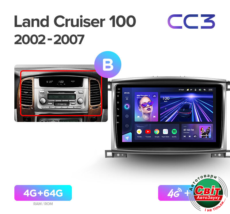 Автомагнітола штатна Teyes CC3 4+64 Gb Toyota Land Cruiser LC 100-A 2002-2007 (B) 9Автомагнітола TeYes CC3 - це сучасний штатний головний пристрій побудований на якісних компонентах, з яким Ви отримаєте швидку швидкість роботи, багатофункціональність та універсальність засновану на новітній операційній системі Android 10, а повна інтеграція з оригінальними системами авто подарує приємні враження від кожної хвилини проведеної в автомобілі.
