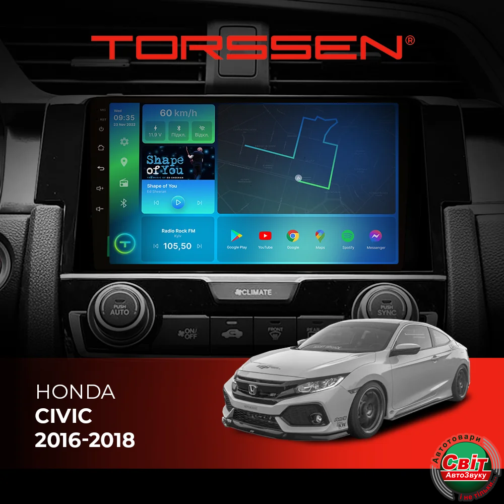- ›Автомагнітола штатна TORSSEN Honda Civic 16-18 FL9 4+64Gb 4G Carplay DSP