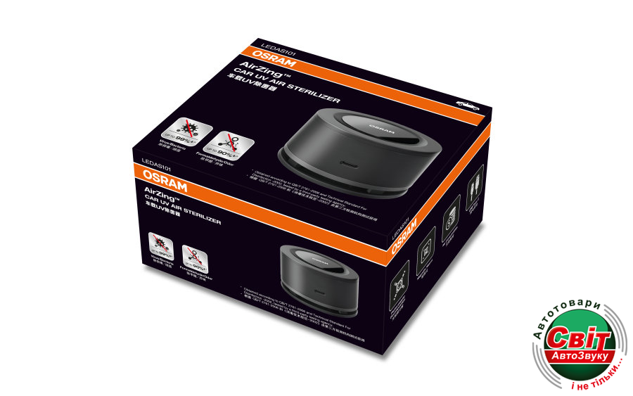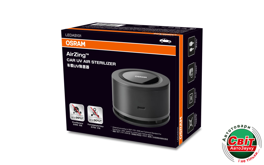 Автомобільний очищувач повітря OSRAM LEDAS101Портативний очищувач повітря OSRAMs AirZing - це інноваційне рішення, яке допомагає очищувати повітря в малих приміщеннях, включаючи транспортні засоби. Для створення цього приладу OSRAM використовував свої знання про ультрафіолетове світло. Очищувач повітря AirZing втягує повітря і пропускає його над пластиною з диоксиду титана, яка в поєднанні з ультрафіолетовим випромінюванням спектру A викликає фото-каталічну реакцію. Ця реакція вбиває шкідливі бактерії й віруси, а також руйнує формальдегід, леткі органічні сполуки процесу очищення повітря також можуть усунути запахи і неприємні запахи, залишивши водіям чисте свіже повітря.