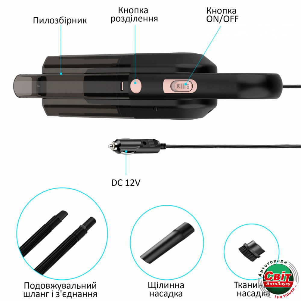 У комплекті з пилососом йдуть три насадки: для пилу і глибокого очищення. З їх допомогою можна ефективно очищати будь-яку частину автомобіля — будь то багажник чи водійське сидіння. Все сміття потрапляє в прозорий контейнер місткістю 0, 7 літри, який легко знімається і швидко спорожняється.