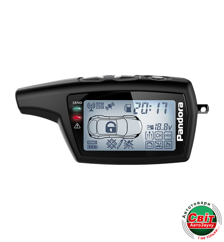 Покращений брелок зворотного зв'язку Pandora D-079 з шкіряним чохлом у комплекті. На екрані дисплея тепер є розділювальна індикація дверей, а також іконка управління і контролю передпускового підігрівача.