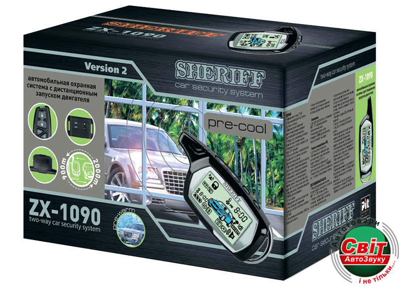 Автосигналізація Sheriff ZX-1090Автомобільна охоронна система з двостороннім зв'язком з динамічним кодом CFMII, чотирма сервісними каналами, інтерактивним LCD-пейджером, системою захисту від угону і захоплення автомобіля, автоматичним запуском двигуна.