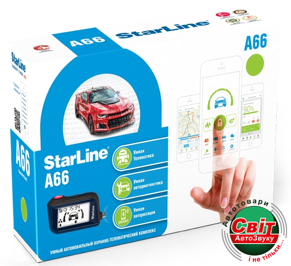 Автосигналізація StarLine A66 ECOНадежный автомобильный охранно-телематический комплекс с несканируемым диалоговым кодом управления, опциональными 2CAN+2LIN, GSM и GPS+ГЛОНАСС интерфейсами, ударопрочным брелком управления, помехозащищенным трансивером с малошумящим усилителем
