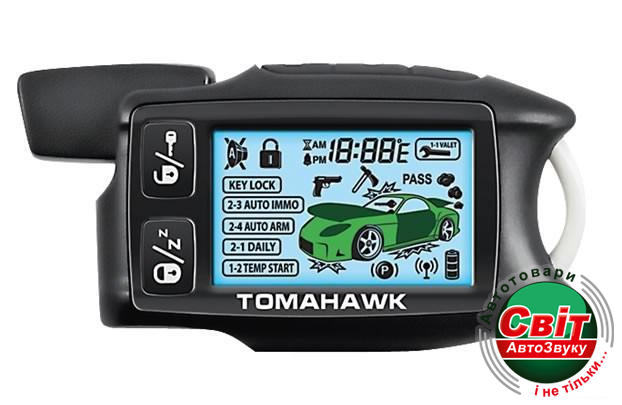 Автосигналізація Tomahawk 9.3Автомобільна охоронна система TOMAHAWK 9.3 зі зворотним зв'язком, діалоговим кодом і автоматичним запуском двигуна. Радіоуправління і сповіщення відбувається на новій несучій частоті 868 мГц. Володіє оптимальним набором охоронних і сервісних функцій.