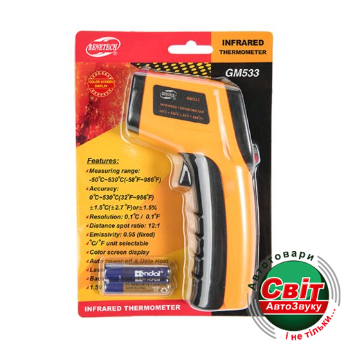 Бесконтактный инфрачервоний термометр (пірометр) Benetech GM533Пирометр GM533 производства компании Benetech это обновлённая модель хорошо зарекомендовавшего себя GM530. Преимущество новой модели заключается в использовании цветного инвертного дисплея. По всем остальным характеристикам, а именно диапазон температур, рабочее расстояние, спектральный диапазон пірометр полностью повторяет старую модель.