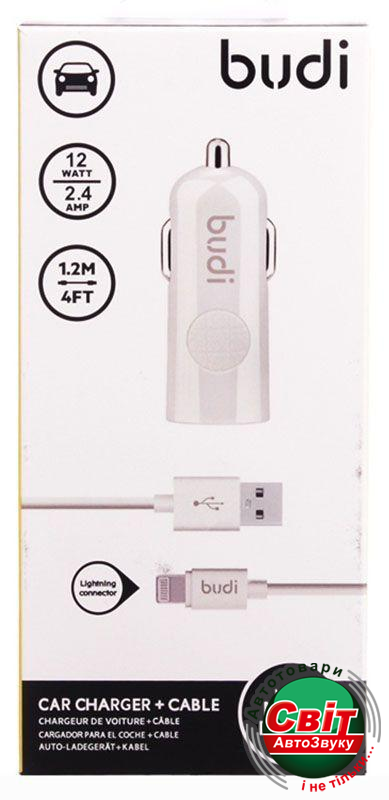 BUDI Car charger White Led 1USB 2.4A + Lightning cable 1.2 m White