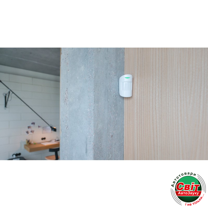 Датчик руху Ajax MotionProtect (white)Беспроводной датчик движения Ajax MotionProtect предназначен для выявления движения человека в охраняемом помещении. Датчик имеет регулируемую чувствительность и способен игнорировать домашних животных весом до 20 кг и ростом до 50 см. Принцип действия датчика основан на определении инфракрасного (ИК) излучения от живого существа. Каждое живое существо, в том числе человек — источник ИК излучения. Как только датчик замечает такое излучение, он анализирует массу живого объекта, и в случае, если она превышает 20 кг, отсылает сигнал тревоги на центральный блок охранной сигнализации по радиоканалу. Специальный алгоритм обработки поступающего сигнала обеспечивает дополнительную проверку объекта по поводу массы и наличия движения, что минимизирует ложные срабатывания от перемещающихся домашних животных. Таким образом датчик срабатывает только при выявлении движении человека. Также датчик не реагирует на перемещение неодушевленных предметов. Если в помещении, например, упадет с вешалки куртка, или сквозняк откроет межкомнатную дверь, датчик не сработает.