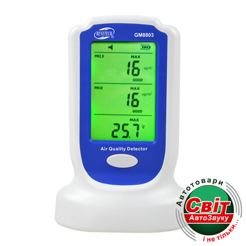 GM8803 - портативний аналізатор аналізатор концентрації дрібнодисперсних твердих частинок виробництва компанії Benetech. Призначений для контролю якості повітря і детектування дрібнодисперсних твердих частинок, пилу та інших включень у складі повітря. Використовується в офісних приміщеннях, медичних, освітніх установах, у місцях скупчення і перебування людей. Прилад має два канали для аналізу твердих дрібнодисперсних частинок: до 10 мкм до 2,5 мкм. Відмінною рисою даного портативного настільного аналізатора концентрації твердих частинок GM8803 є висока точність вимірювання, великий дисплей, на якому відображається концентрація частинок розміром до 2,5 мкм до 10 мкм, температура і вологість повітря, а так-же реалізована колірна сигналізація зон допустимої концентрації частинок. Робота аналізатора GM8803 заснована на технології лазерної фотометрії розсіяного світла. Мінімальний дозвіл розміру частинок 0,3 мкм. Харчування аналізатора забезпечують три акумулятори типу AAA (NiMH).