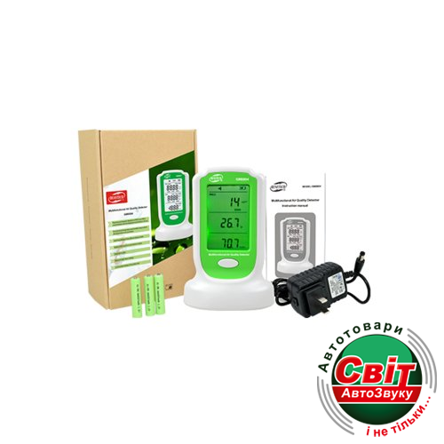 Детектор якості повітря Benetech GM8804GM8804 - портативный анализатор концентрации формальдегида и твёрдых частиц произодства компании Benetech. Предназначен для контроля качества воздуха, концентрации формальдегида и детектирования твёрдых мелкодисперсных частиц, пыли и других включений в составе воздуха. Используется на производстве, в офисных помещениях, медицинских, образовательных учреждениях, в местах длительного пребывания людей. Прибор имеет два канала для анализа твердых мелкодисперсных частиц: до 10 мкм и до 2,5 мкм и канал измерения концентрации формальдегида. Отличительной чертой данного портативного настольного анализатора GM8804 являются высокая точность измерения, большой дисплей, на котором отображается концентрация частиц размером до 2,5 мкм, до 10 мкм, концентрация формальдегида, температура и влажность воздуха, а так-же реализована цветовая сигнализация зон допустимой концентрации. Работа анализатора GM8804 основана на технологии лазерной фотометрии рассеянного света. Минимальное разрешение размера частиц 0,3 мкм. Питание анализатора обеспечивают три аккумулятора типа ААА (NiMH).