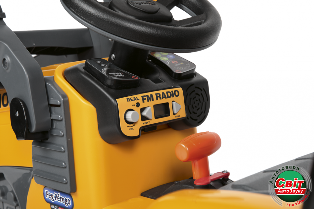 Трудится и играть с таким экскаватором весело. Для поднятия настроения он оснащен настоящим FM-радио. Также имеется переключатель скоростей и руль. Управлять таким транспортным средством и его ковшом легко и под силу даже самым маленьким шоферам. Без перезарядки электромобиль сможет преодолеть расстояние в 4-6 км.