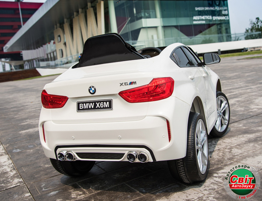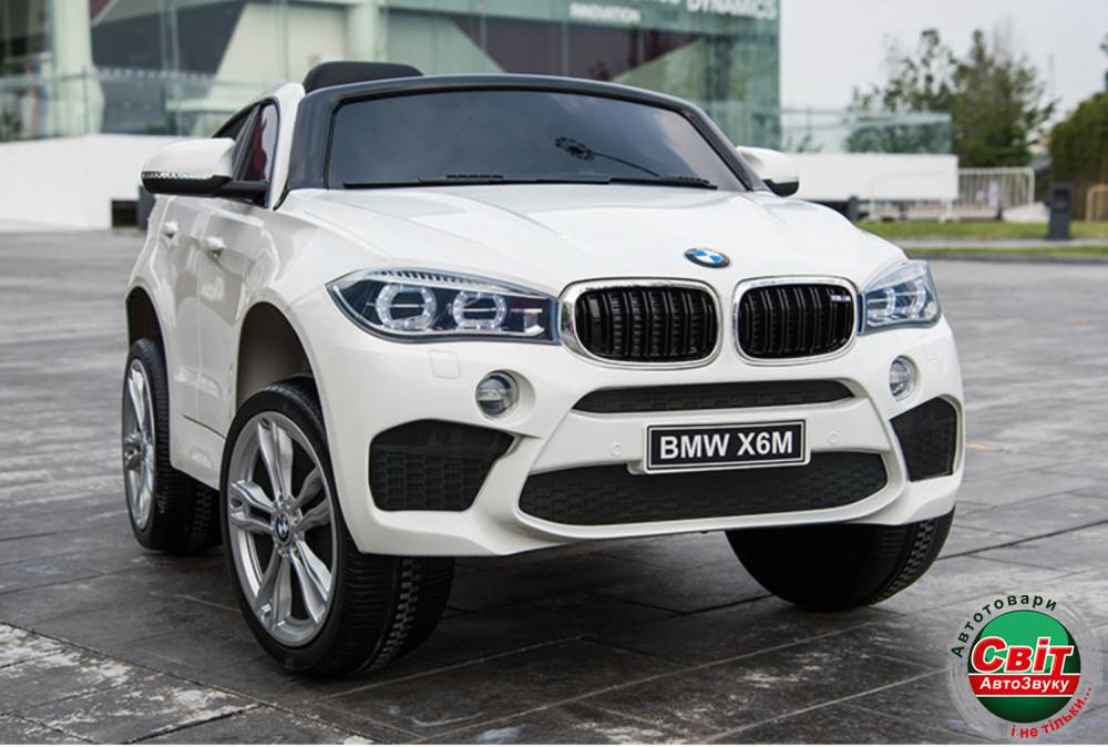 Дитячий електромобіль Kidsauto BMW X6 M premium edition WhiteДетская версия престижного кроссовера BMW X6 создана с максимальной заботой о безопасности и комфорте ребенка. Пульт управления (2,4G) позволяет дистанционно контролировать скорость и направление, а при необходимости остановить машину кнопкой «STOP». Кожаное сидение, мягкие EVA-колеса , функция плавного старт-стопа, мощные моторы, обеспечат комфортный и уверенный драйв.