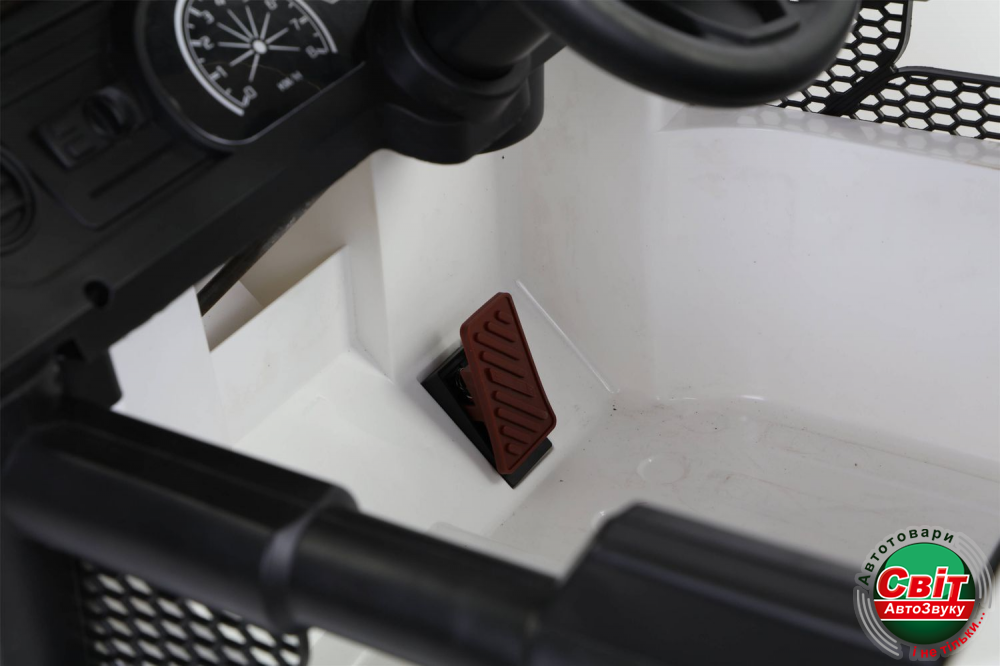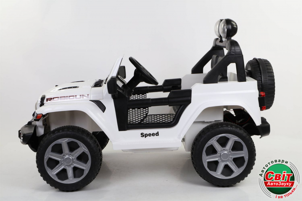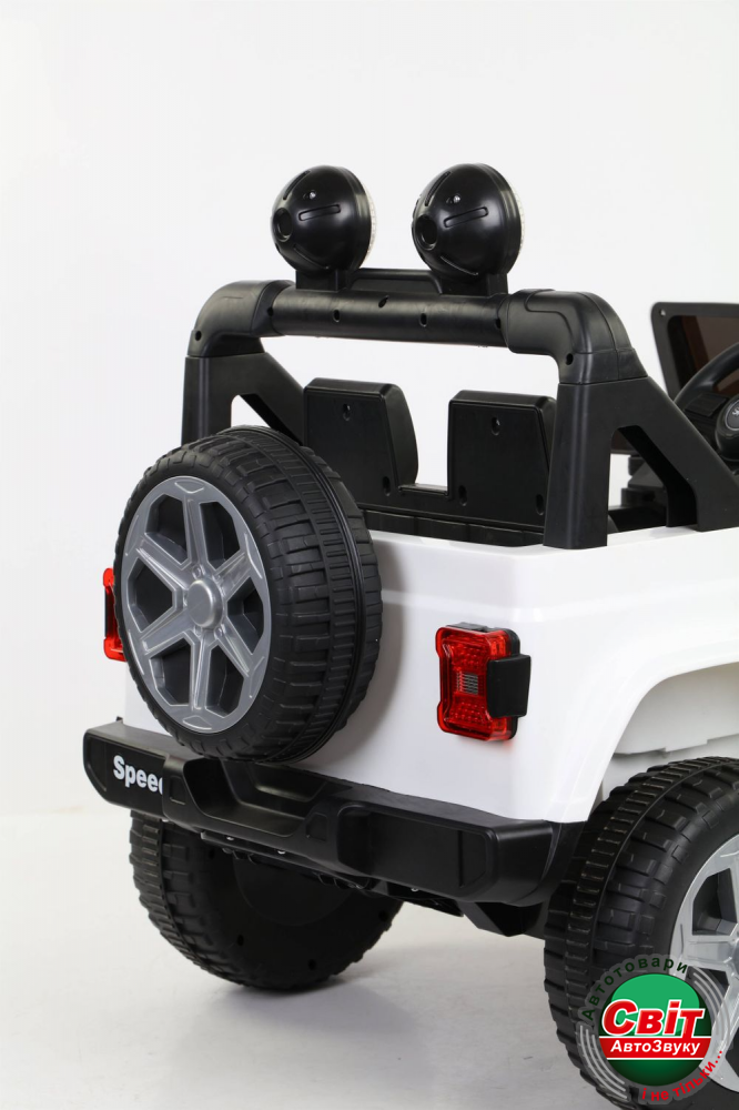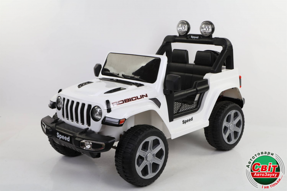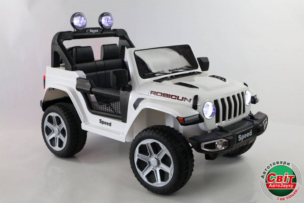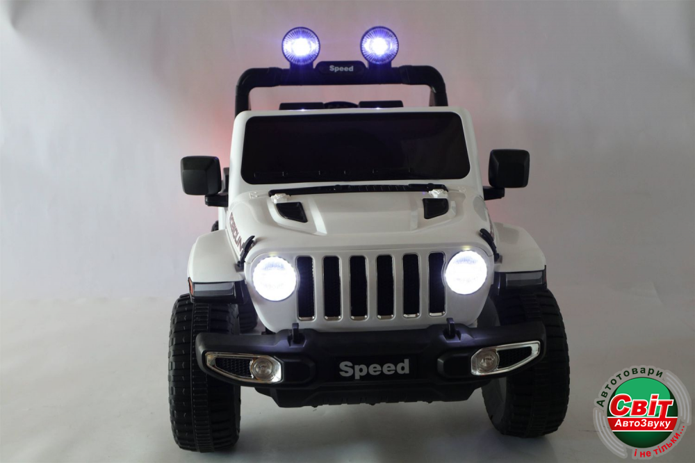 Дитячий електромобіль Kidsauto Jeep Wrangler Rubicon style 4x4 білийДвухместный Jeep Wrangler style 4х4. Мощный полноприводный (4 мотора х 35Вт) внедорожник. Высокий дорожный просвет, большие резиновые EVA-колеса. Электромобиль заводится ключом зажигания. Мягкое сиденье из эко-кожи с ремнями безопасности, амортизаторы. Красивая подсветка приборной панели. Яркие светодиодные фары: передние, задние и верхние фонари. Штатный МР3-плеер сделает прогулку еще более интересной.