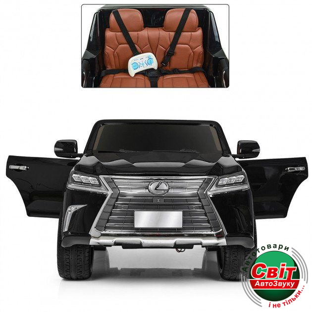 Дитячий електромобіль Kidsauto Lexus LX-570 (4WD, МР4 планшет) чорний (двомісний)Лицензионный Lexus LX-570 4x4 c видеоплеером МР4 создан с максимальной заботой о ребенке. Предусмотрено водительское и дистанционное управление. Пульт ДУ (2,4G) позволяет родителям контролировать скорость, направление движения, и остановить машину кнопкой «STOP».