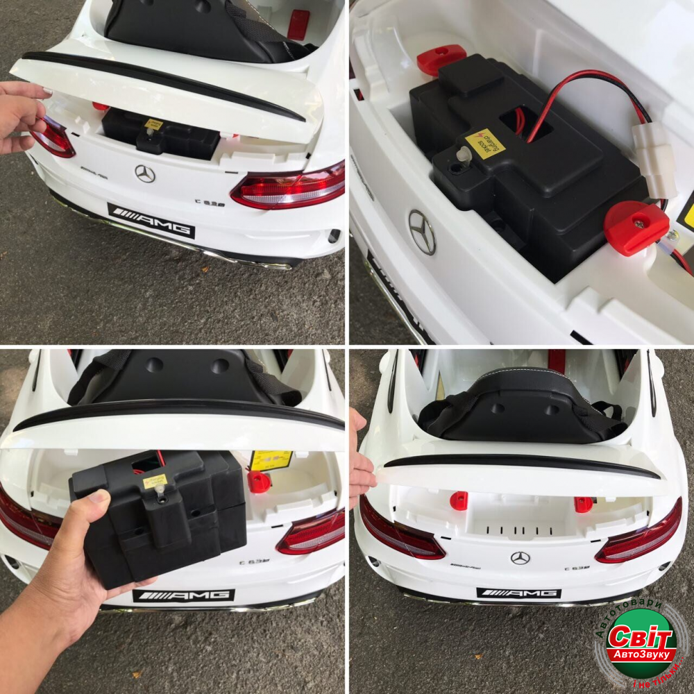 Съёмный аккумулятор  - можно заряжать отдельно от электромобиля. Электро-руль с возвратным механизмом. Мягкие колёса из EVA-резины. Два мотора 12V. Амортизаторы. Кожаное сидение. Открывающиеся двери. Чёрные диски AMG. LED-оптика - вкл/выкл. Аудио-система с USB. Ручка для перевозки по принципу "чемодан".