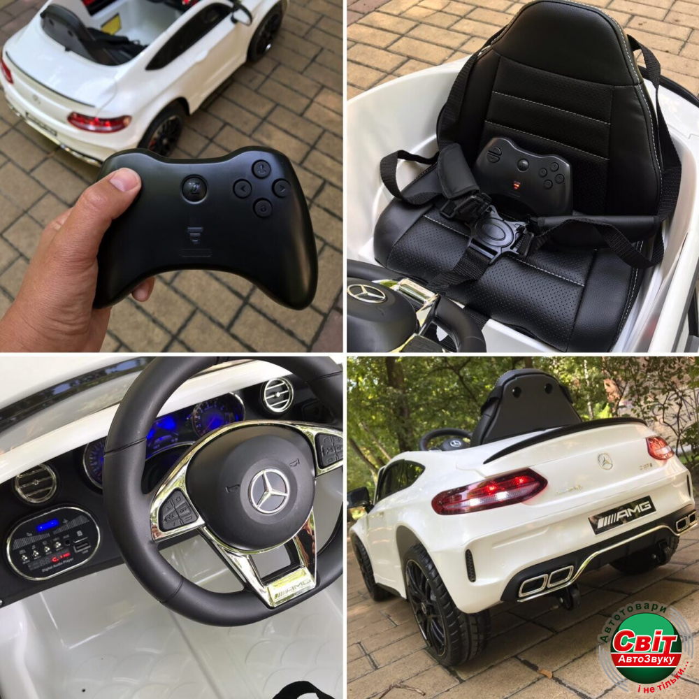 Съёмный аккумулятор - можно заряжать отдельно от электромобиля. Электро-руль с возвратным механизмом. Мягкие колёса из EVA-резины. Два мотора 12V. Амортизаторы. Кожаное сидение. Открывающиеся двери. Чёрные диски AMG. LED-оптика - вкл/выкл. Аудио-система с USB. Ручка для перевозки по принципу "чемодан".