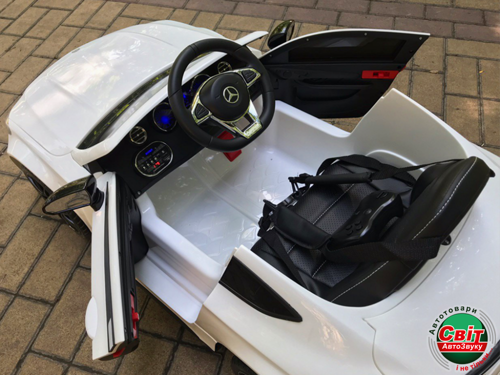 Съёмный аккумулятор - можно заряжать отдельно от электромобиля. Электро-руль с возвратным механизмом. Мягкие колёса из EVA-резины. Два мотора 12V. Амортизаторы. Кожаное сидение. Открывающиеся двери. Чёрные диски AMG. LED-оптика - вкл/выкл. Аудио-система с USB. Ручка для перевозки по принципу "чемодан".