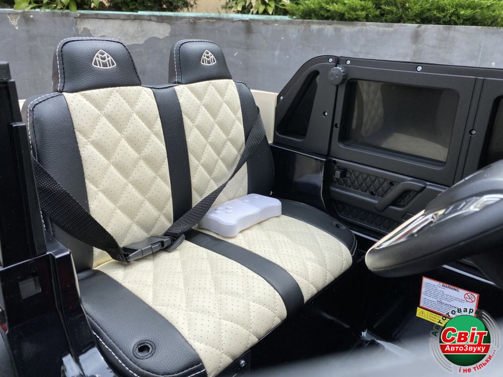 Мягкие колеса из EVA-резины, амортизаторы, плавный “Старт-стоп”, кожаное сидение с ремнем безопасности позаботятся о безопасности и комфорте ребёнка. В автомобиле предусмотрено водительское и дистанционное управление.