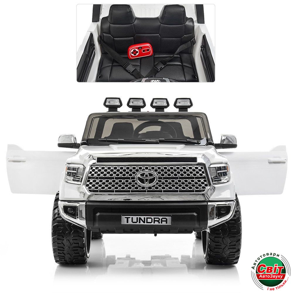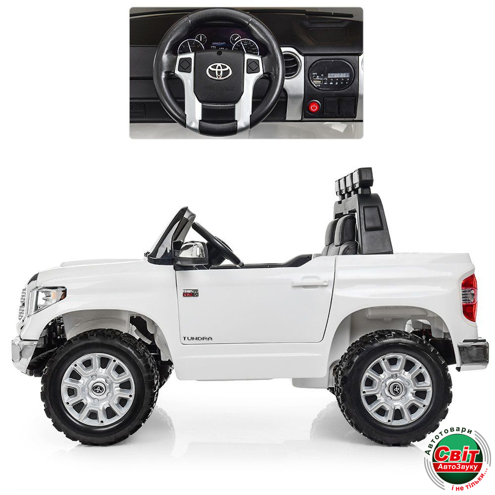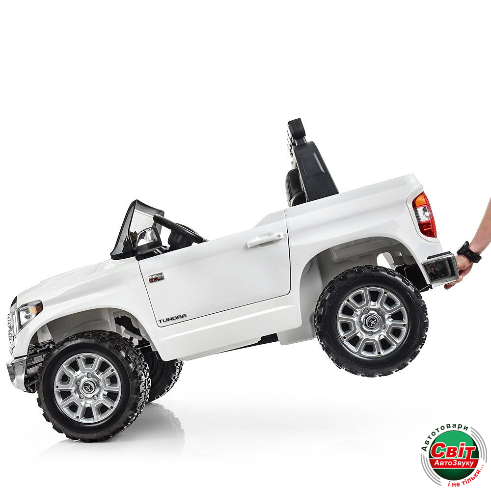 Дитячий електромобіль Kidsauto Toyota Tundra small WhiteДвухместный внедорожник с рулевым и дистанционным управлением. Пульт управления оснащен кнопкой «Stop», кнопками управления скоростью и направлением движения. Безопасный и уверенный драйв по «пересеченке» обеспечат мощные (2х45Вт) моторы, большие мягкие EVA-колеса, функция «плавный Старт/стоп». Яркая LED-оптика станет незаменимой в вечернее время, а МР3-плеер и музыкальный руль сделают прогулку еще более увлекательной.