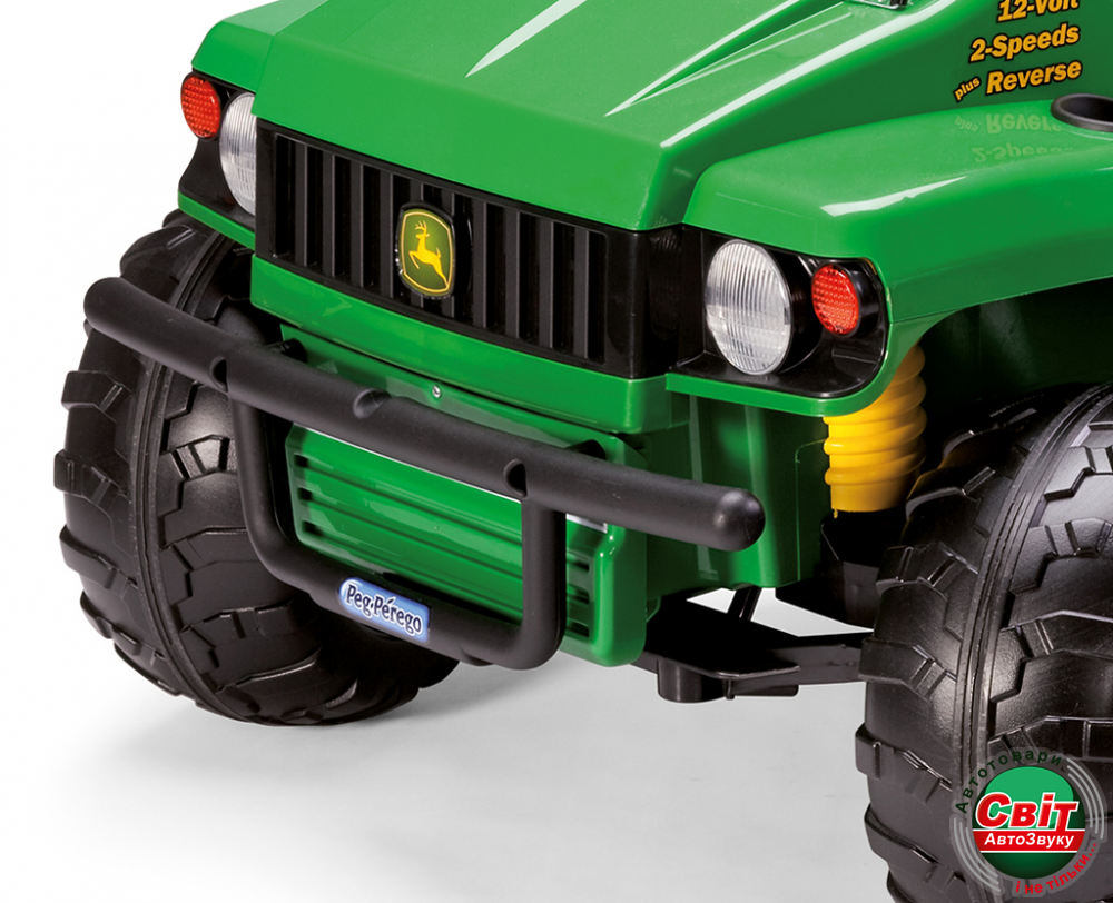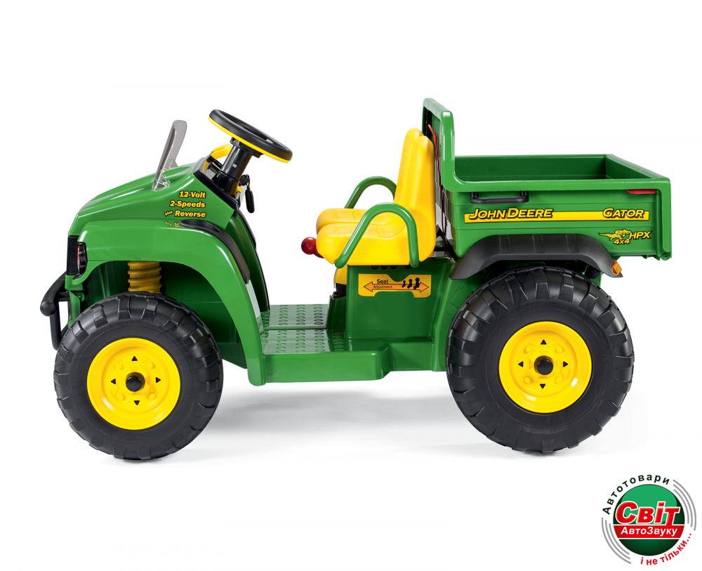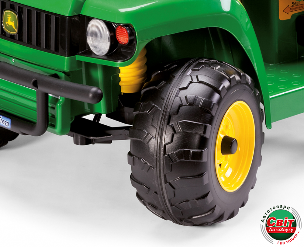 Максимальная скорость грузовика 6,3 км/час может быть ограничена родителями, если возникнет такая необходимость. Есть в электромобиле «John Deere Gator HPX» Peg-Perego два широких сидения, которые регулируются под каждого ребёнка.