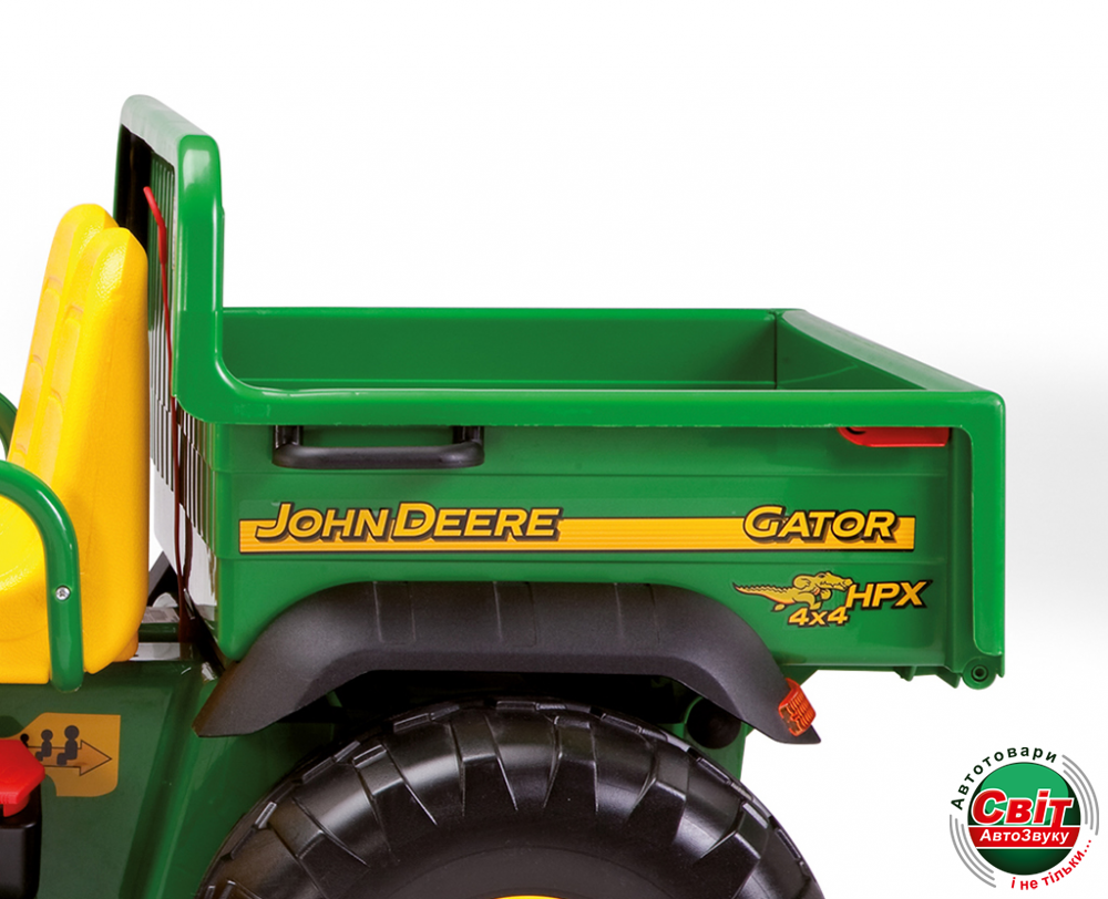 Главной «изюминкой» электромобиля «John Deere Gator HPX» Peg-Perego является кузов, который можно перемещать вверх и вниз. Невероятную радость доставит такой подарок ребёнку, ведь на таком грузовике можно не только ездить по двору, но ещё и перевозить игрушки, мамины покупки, а также песок с детской площадки.