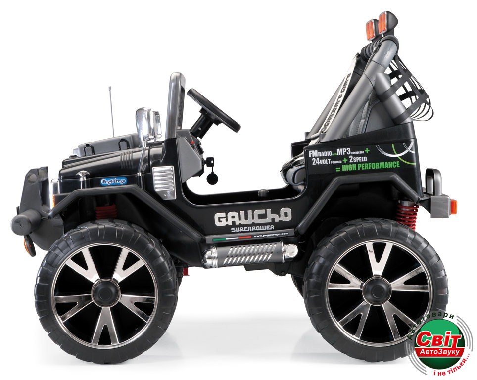 - Gaucho Superpower оснащен штатной аудиосистемой. Выберите любимую радиостанцию на встроенном FM-приемнике, или подключите ваш MP3-плеер/смартфон в AUX-вход и всей семьей слушайте свою музыкальную коллекцию через динамики электромобиля.