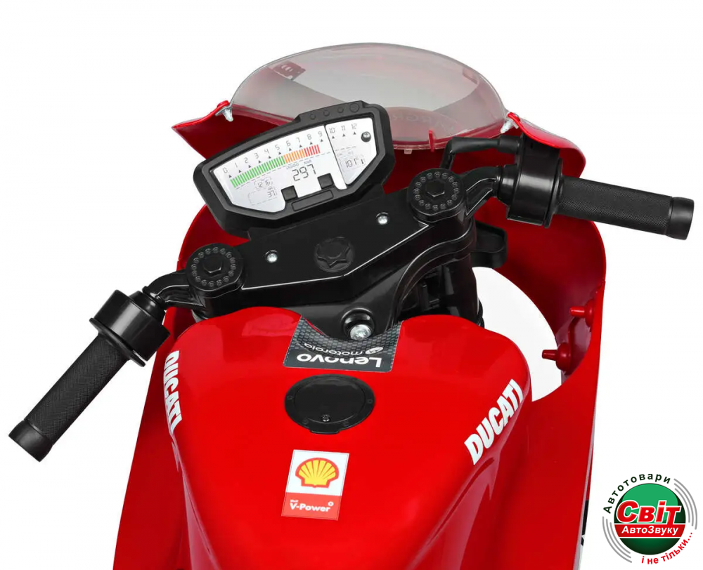 Мотоцикл Ducati створює враження потужного крутого транспорту, який оснащений гумовими колесами, ручкою газу на кермі і педалями гальма.