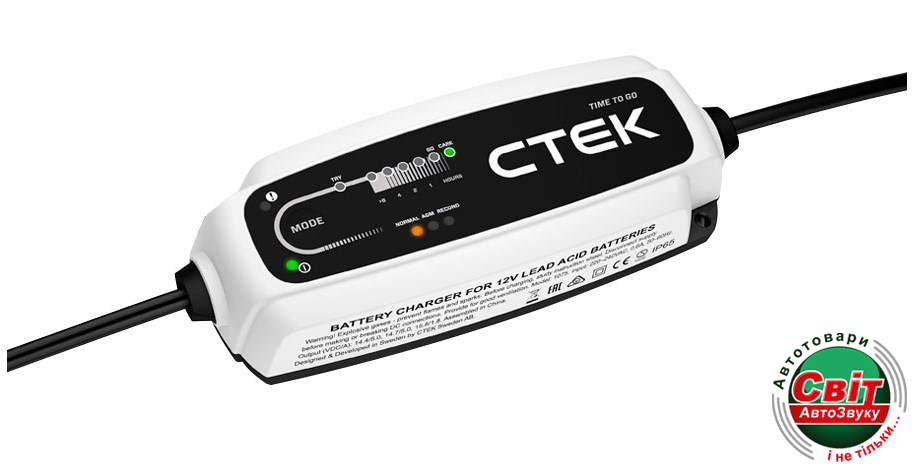 Повністю автоматизований зарядний пристрій CTEK CT5 TIME TO GO забезпечує зарядний струм 5А для всіх типів свинцево-кислотних 12V батарей від 20Ач до 160Ач.