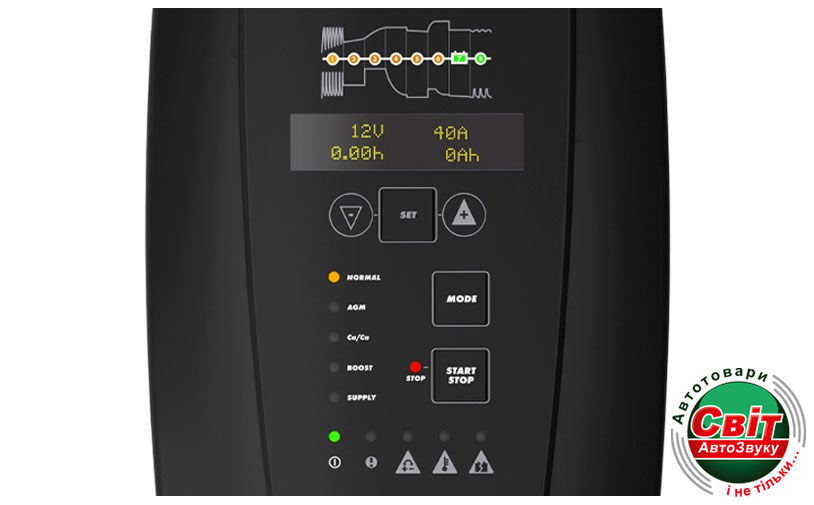 • Тип акумуляторів: Усі типи свинцево-кислотних акумуляторів, 12В, 24В, WET, MF, Ca/Ca, AGM, GEL