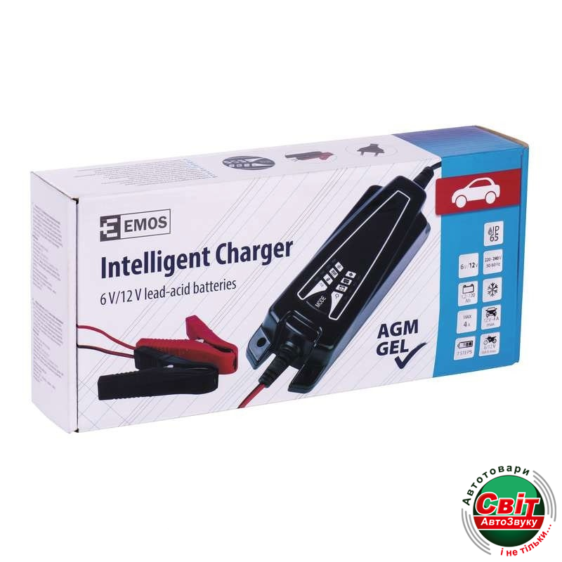 Зарядний пристрій для акумуляторів Emos № 1014Импульсное зарядное устройство Emos N1014 подойдет для большинства современных стартерных аккумуляторных батарей с номинальным напряжение 6 вольт и 12 вольт. Данное устройство производится в Чехии, и соответствует жестким стандартам качества. Процесс заряда происходит в 7 этапов, которые контролируются встроенным MCU. По завершению всего цикла заряда, устройство переходит в режим поддержания, благодаря этому вам нет необходимости следить за процессом зарядки, устройство все сделает автоматически. Устройство имеет четыре основных режима работы, первый и второй из которых, соответственно, для 6 вольтовых и 12 вольтовых аккумуляторов малой емкости, которые используются в мотоциклах, скутерах, мопедах. Третий режим для классических автомобильных аккумуляторов с жидким электролитом, а также гелевых и частично AGM батарей.