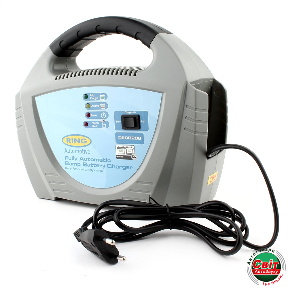 Зарядний пристрій для акумуляторів Ring RECB208Автомобильное зарядное устройство Ring RECB208 специально разработанное для подзарядки стартерных автомобильных батарей гелевого и свинцово-кислотного типа. Широкий диапазон емкостных параметров заряжаемых АКБ, от 20 до 120 А/ч, делает данное устройство универсальным в применении с возможностью использования для большинства современных легковых автомобилей. Процесс зарядки происходит в автоматическом режиме согласно установленным параметрам.