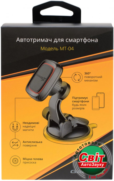 Тримач для телефона Grand-X MT-04Простой в установке и пользовании, автомобильный держатель Grand-X МТ-04 подойдет для смартфонов любых размеров. Универсальность крепления позволяет использовать данный держатель практически в любом автомобиле. В автомобильно держателе Grand-X MT-04 предусмотрена возможность изменять угол наклона самого держателя в широком диапазоне, что позволяет пользователю разместить его максимально удобно. Одним движением руки вы можете легко менять положение смартфона с вертикального на горизонтальное и обратно, а мощные неодимовые магниты надежно держат смартфон на всех поворотах и неровностях дороги. От аналогов по цене Grand-X MT-04 выгодно отличается качеством, а от аналогов по качеству — выгодной ценой!