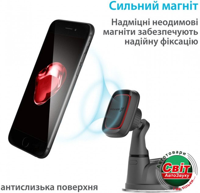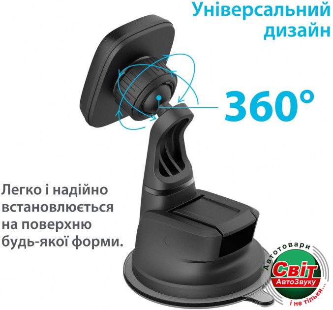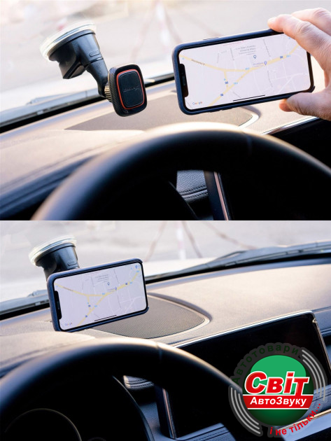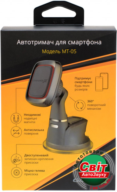 Тримач для телефона Grand-X MT-05Простой в установке и пользовании, автомобильный держатель Grand-X подойдет для смартфонов любых размеров. Универсальность крепления позволяет использовать данный держатель практически в любом автомобиле. Одним движением руки вы можете легко менять положение смартфона с вертикального на горизонтальное и обратно, а мощные неодимовые магниты надежно держат смартфон на всех поворотах и неровностях дороги. Поверность к которой непосредственно крепится смартфон поворачивается на 360 градусов, позволяя менять угол наклона смартвона. Клейкая гелевая основа присоски с и технология двойного щелчка дают дополнительную фиксацию, что способствует максимальной надежности крепления.