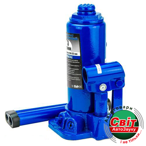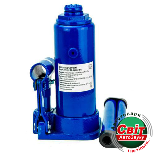 Домкрат Vitol ДБ-03006 (T90304)Гідравлічний домкрат Vitol ДБ-03006/T90304 універсальний вантажний механізм, призначений для підіймання, утримання та фіксації автомобіля, у процесі проведення ремонтних і діагностичних робіт. Модель ДБ-03006/T90304 пляшкового типу, має максимальну вантажопідіймальність 3тони, чого цілком досить для легкового автомобіля. Перевагою цього домкрата є гарна висота підіймання 372 мм і висота підхоплення 194 мм, що дає змогу розширити сферу застосування й ефективно виконувати ремонтні роботи. Подовжена металева приводна ручка, складаної конструкції, передає посилення на насос, що нагнітається, де нагнітається робоча рідина, яка забезпечує плавний хід під час здійснення підіймання й опускання вантажу. Конструкція домкрата представлена у формі пляшки, корпус которго зроблений із міцного металу. Поверхня корпусу покрита спеціальним лакофарбовим покриттям, для запобігання процесу корозії металу та забезпечує тривалий термін експлуатації пристрою. Завдяки широкій опорній поверхні домкрат досить стійкий і захищений від бічного ковзання.