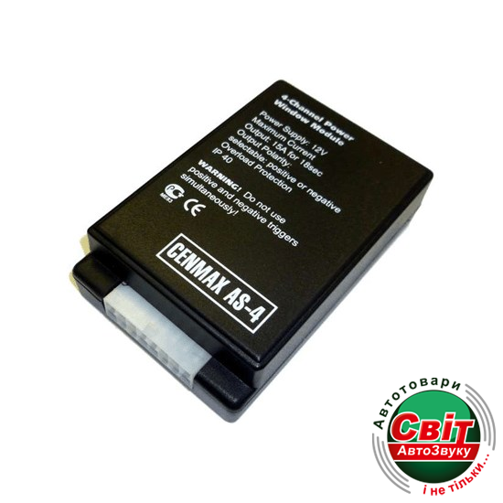 Інтерфейс склопідйомника Cenmax AS-4 (4 стекла)Модуль предназначен для совместной работы с автомобильной сигнализацией или другим устройством, имеющим выход , на котором появляется импульс отрицательной или положительной полярности, при изменении состояния системы (например, при постановке на охрану). Модуль обеспечивает автоматическое поочередное закрытие стекол или потолочного люка при наличии электрического привода последних.