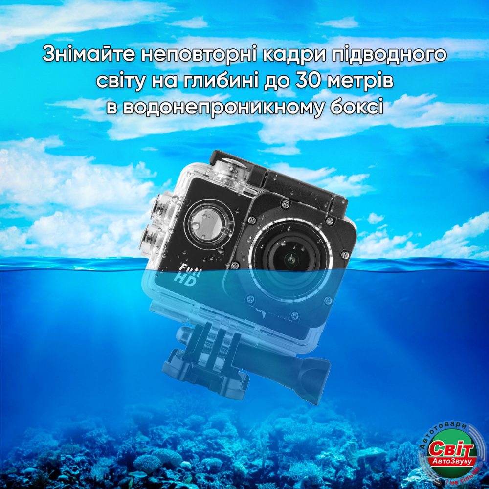 Угол обзора в 120 градусов способен словить удивительный кадр как с высоты птичьего полета, так и открыть тайны невиданных глубин. Водонепроницаемый кейс поможет погрузиться и заснять неповторимые кадры подводного мира на глубине до 30 метров.