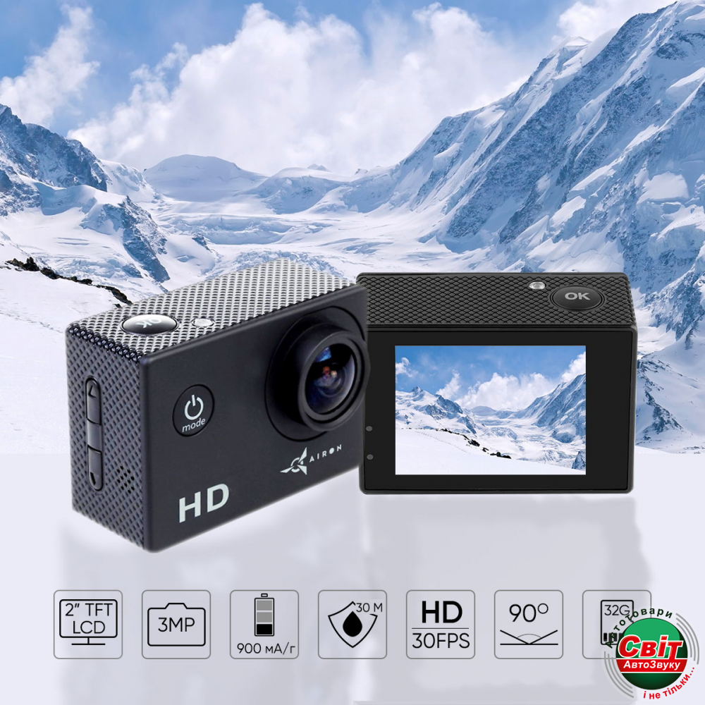 Екшн-камера AIRON Simple HD запечатлеет экзотические пейзажи даже на глубине до 30 метров, при этом позволит охватить угол обзора в 90 градусов.AIRON Simple HD оснащена литий-ионным аккумулятором, который позволяет снимать видео на протяжении более полутора часов.